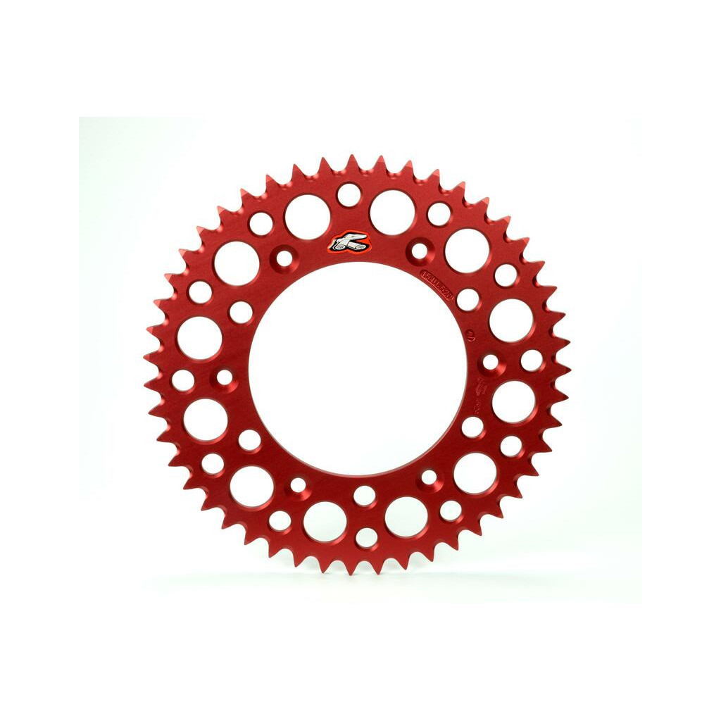 Couronne Renthal Ultralight™ anti boue Usinée avec une grande précision dans un aluminium 7075 T6 très léger et très résistant.Profil dessiné pour les dents qui permet de faciliter l’évacuation de la boue et réduit au maximum les pertes de puissance dûes à la friction entre la chaîne et la couronne. L’anodisation durcit la matière en surface et améliore aussi l’esthétique. Des alésages sont réalisés sur la couronne à des endroits stratégiques afin d’alléger la pièce sans diminuer la résistance. Cette couronne vous apportera un gain en poids, en puissance, en résistance et en longévité. Un atout pour le MX, SX ou l’enduro.