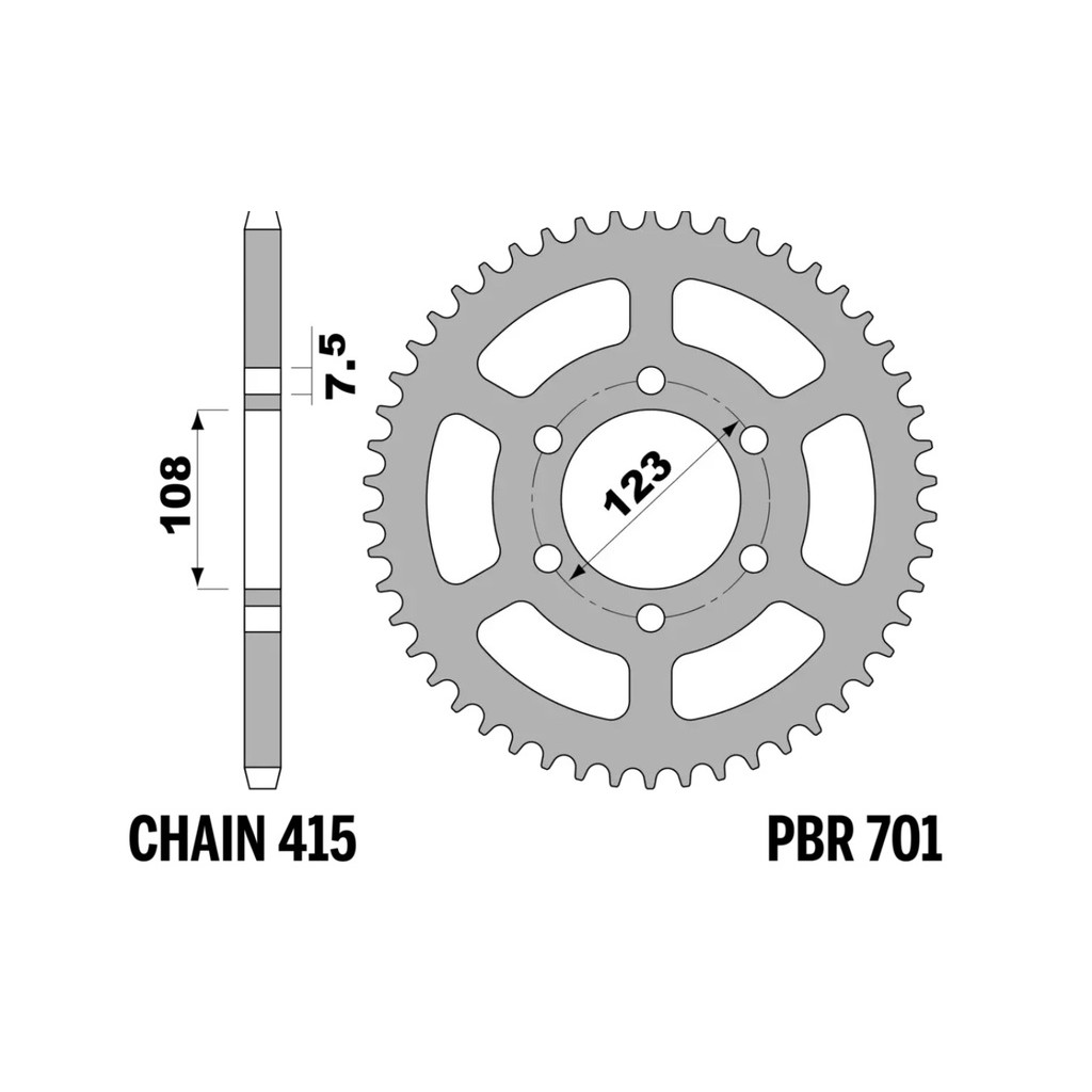 MAIN FEATURES:Material: High-quality steel, renowned for its strength and durability.Teeth: Configurations are available to suit different riding needs.Pitch: Compatible with chains of 415 pitch.Color: Available in black or natural steel finish, blending an attractive aesthetic with corrosion protection.ADVANTAGES:Superior Resistance: Steel construction ensures excellent wear resistance, extending the sprocket’s lifespan.Consistent Performance: Designed to maintain high performance even in extreme conditions, ensuring reliability on both road and off-road terrains.LONGEVITY AND MAINTENANCE:With proper maintenance, these sprockets can achieve a lifespan of over 15,000 km, offering long-term reliability.Note: Ensure the correct tooth configuration and pitch for your motorcycle model for optimal performance.