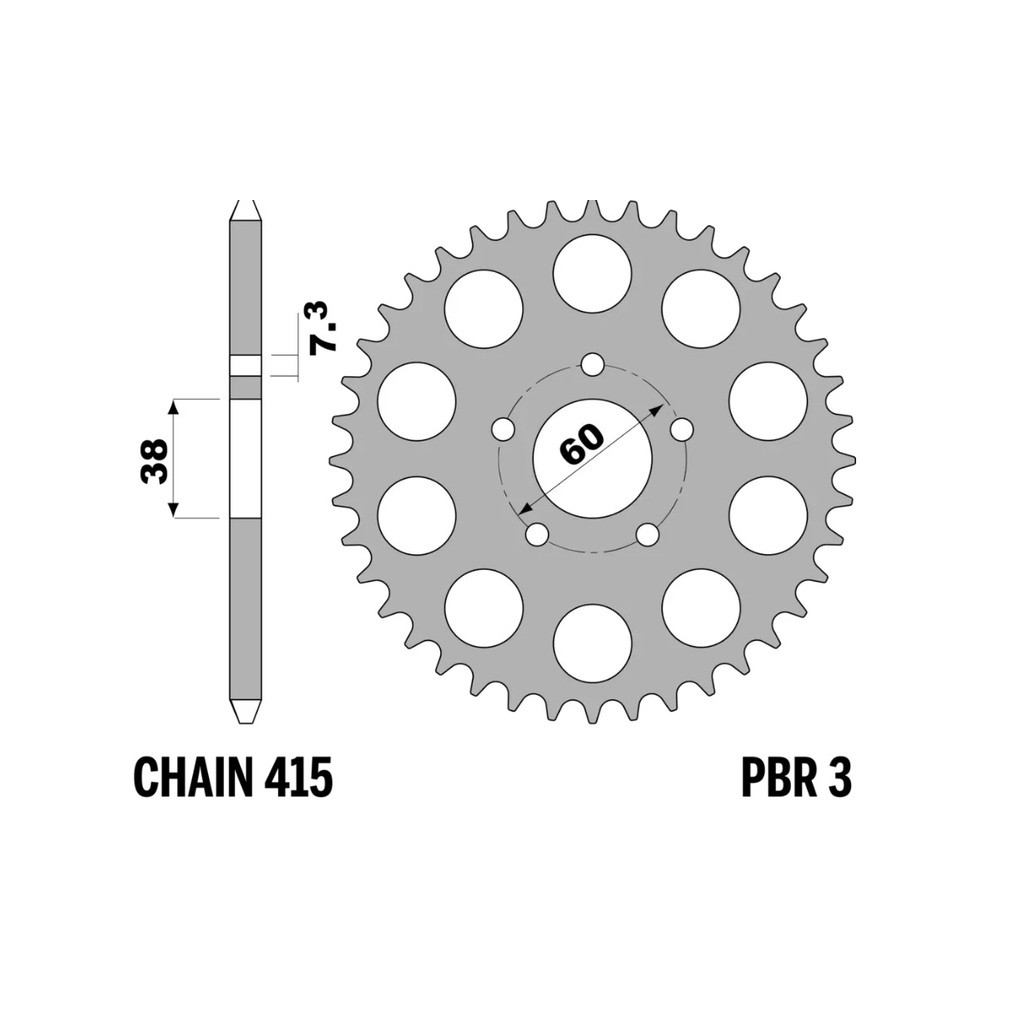 The PBR steel sprocket, Item: 3 34 F, is derived from components we supply as original equipment to leading motorcycle manufacturers. Designed to deliver strength and reliability, it is ideal for riders seeking durability and consistent performance, even in the toughest riding conditions. Manufactured from high-quality steel, this sprocket ensures long-lasting performance and an excellent value-for-money ratio, with no compromise on quality.MAIN FEATURES:Material: High-quality steel, renowned for its strength and durability.Teeth: This sprocket has 34 teeth. Other configurations are available to suit different riding needs.Pitch: Compatible with chains of 415 pitch.Color: Available in black or natural steel finish, blending an attractive aesthetic with corrosion protection.ADVANTAGES:Superior Resistance: Steel construction ensures excellent wear resistance, extending the sprocket’s lifespan.Consistent Performance: Designed to maintain high performance even in extreme conditions, ensuring reliability on both road and off-road terrains.LONGEVITY AND MAINTENANCE:With proper maintenance, these sprockets can achieve a lifespan of over 15,000 km, offering long-term reliability.Note: Ensure the correct tooth configuration and pitch for your motorcycle model for optimal performance.