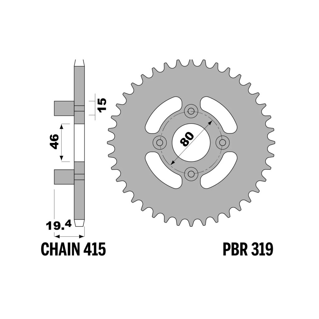 The PBR steel sprocket, Item: 319 48 F, is derived from components we supply as original equipment to leading motorcycle manufacturers. Designed to deliver strength and reliability, it is ideal for riders seeking durability and consistent performance, even in the toughest riding conditions. Manufactured from high-quality steel, this sprocket ensures long-lasting performance and an excellent value-for-money ratio, with no compromise on quality.MAIN FEATURES:Material: High-quality steel, renowned for its strength and durability.Teeth: This sprocket has 48 teeth. Other configurations are available to suit different riding needs.Pitch: Compatible with chains of 415 pitch.Color: Available in black or natural steel finish, blending an attractive aesthetic with corrosion protection.ADVANTAGES:Superior Resistance: Steel construction ensures excellent wear resistance, extending the sprocket’s lifespan.Consistent Performance: Designed to maintain high performance even in extreme conditions, ensuring reliability on both road and off-road terrains.LONGEVITY AND MAINTENANCE:With proper maintenance, these sprockets can achieve a lifespan of over 15,000 km, offering long-term reliability.Note: Ensure the correct tooth configuration and pitch for your motorcycle model for optimal performance.