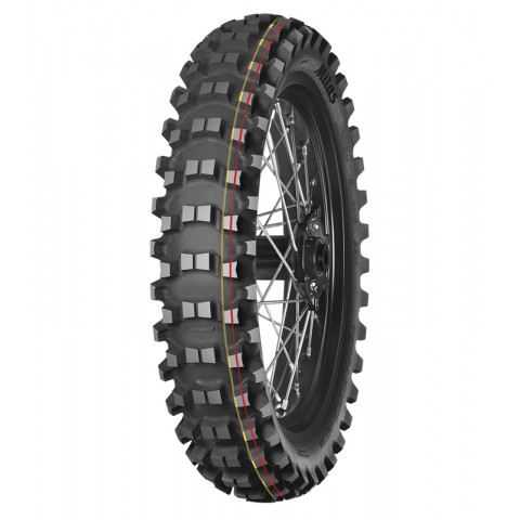 Il est identifiable par ses bandes jaunes et rouges caractéristiques et est également disponible en tailles Junior MX. C'est un pneu NHS (Not for Highway Service).