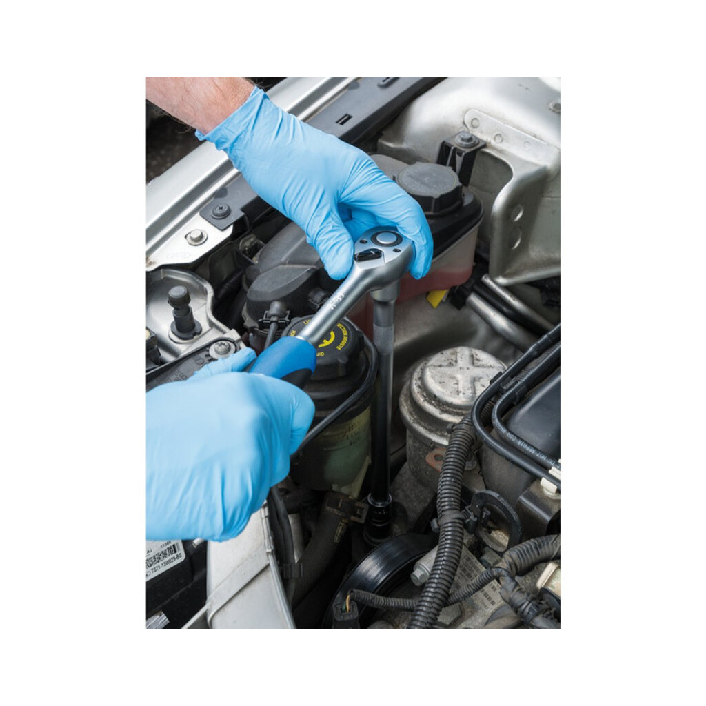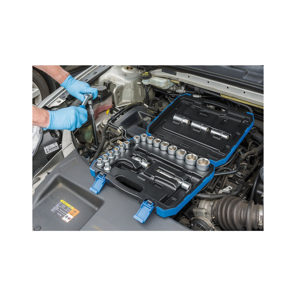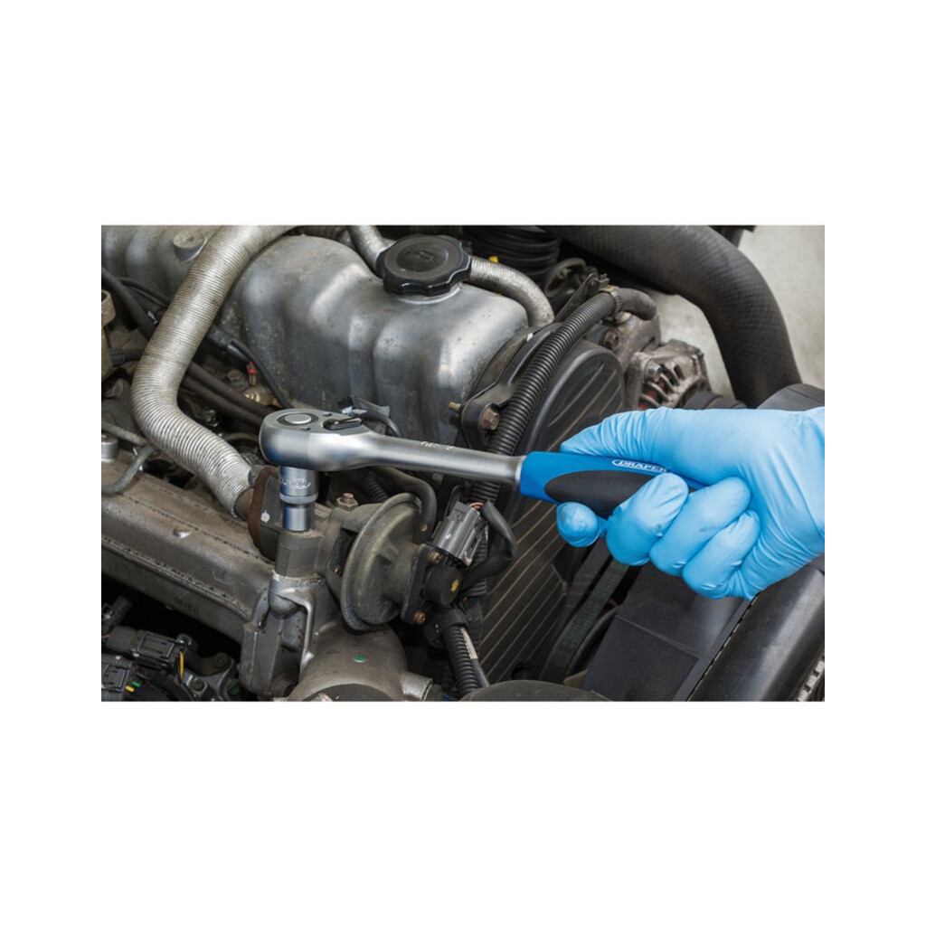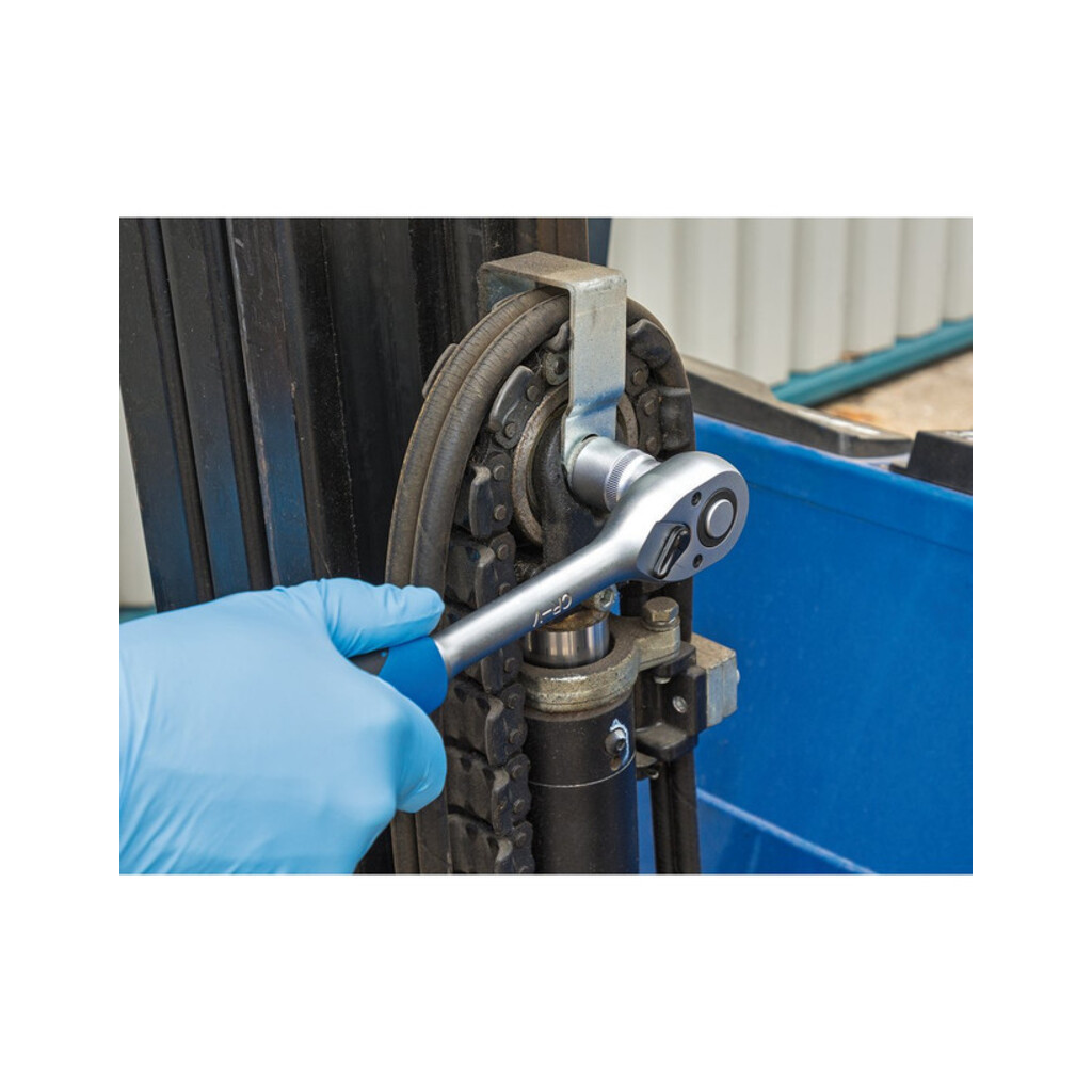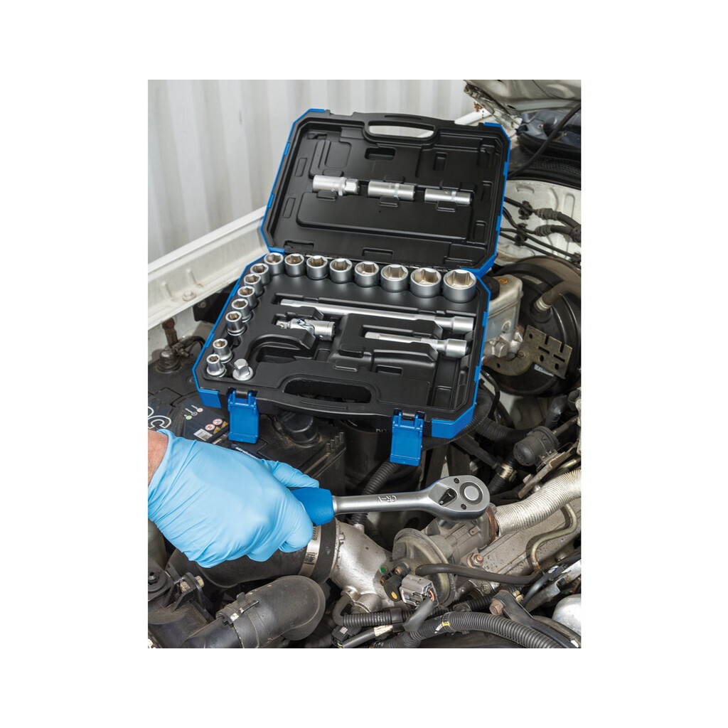 Douille à six pans en acier au chrome vanadium trempé et revenu avec une finition satinée. Fourni avec un cliquet réversible à prise souple de 72 dents et des accessoires. Emballé dans un étui de rangement en plastique.