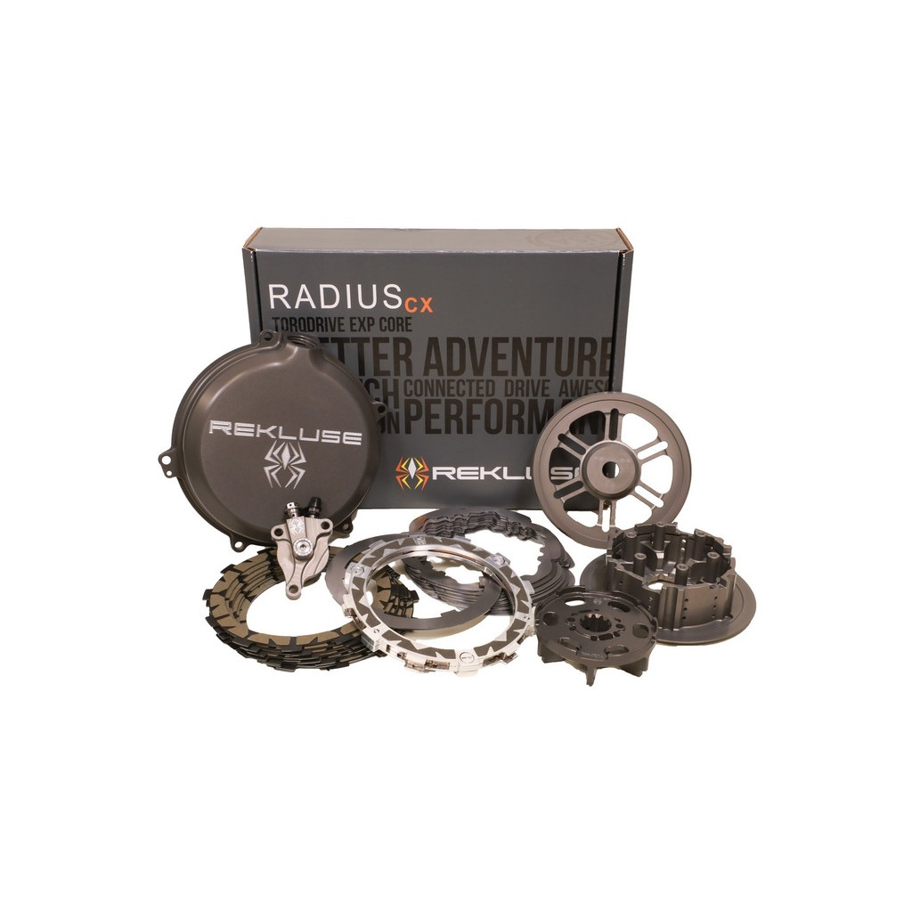 RadiusCX est un ensemble complet de fonctionnalités d'embrayage automatique, de puissance améliorée et de durabilité accrue. Les kits RadiusCX comprennent le disque d'embrayage automatique EXP 4.0 de nouvelle génération de Rekluse, le moyeu intérieur et le plateau de pression en aluminium, la technologie de disque de friction TorqDrive, ainsi qu'un couvercle d'embrayage.