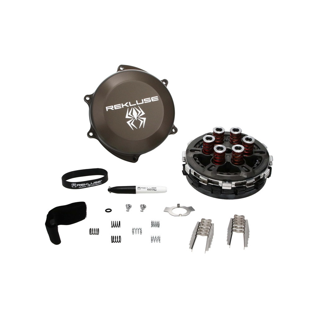 RadiusCX est la solution complète combinant fonctionnalité d'embrayage automatique, amélioration de la transmission de puissance et durabilité renforcée. Les kits RadiusCX incluent le disque d'embrayage automatique EXP 4.0 de nouvelle génération de Rekluse, un moyeu interne et un plateau de pression Core en aluminium usiné, la technologie de disques de friction TorqDrive, ainsi qu'un couvercle d'embrayage pour compléter l'ensemble. Les disques TorqDrive et l'EXP 4.0 offrent une transmission de puissance accrue et une modulation d'embrayage plus fiable et réactive. Les composants Core usinés de Rekluse maintiennent l'embrayage plus frais et résistent à l'usure grâce à une circulation d'huile améliorée et des revêtements anodisés durs, tout en offrant une sensation de levier améliorée et constante. Fourni également avec des manchons de panier pour éviter l'usure des paniers d'embrayage, le RadiusCX est le kit d'embrayage automatique haute performance ultime, configurable pour s'adapter aux préférences de presque tous les pilotes.