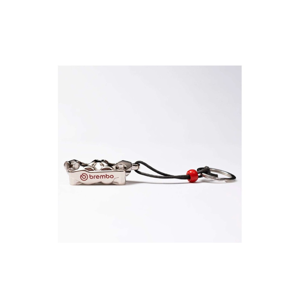 Porte-clés étrier de frein moto "HYPURE" avec pendentif (nouveau modèle), plastique rigide avec métallisation argentée, tampographie 1 couleur logo "Brembo" en rouge, finition PCD (bille plate cassée + cordon gris + bille rouge).