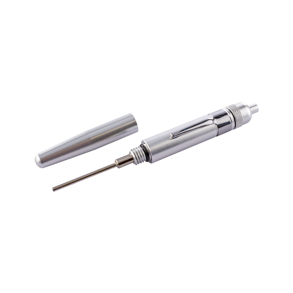 En alu poli, avec clip pour maitien en poche. Conçu pour de la lubrification de précision en zone à accès limité. Applicateur aiguille d'une longueur de 40mm avec contrôle du débit. Emballé en boîte présentoir. Longueur de 145mm
