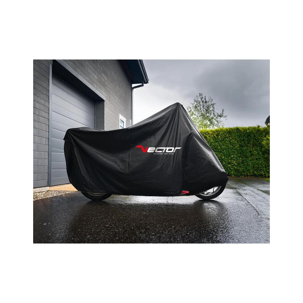 Conçue pour les grosses motos de route, elle répond aux exigences les plus élevées des motards, avec des caractéristiques telles que des ouvertures de ventilation intégrées, une protection contre la chaleur des deux côtés (jusqu'à environ 100 degrés Celsius), et un œillet renforcé pour la protection anti-vol. La housse se fixe à la moto à l'aide d'une fermeture à clic ajustable. Le lettrage VECTOR blanc à fort contraste sur les côtés longs de la housse noire souligne visuellement ce produit premium.