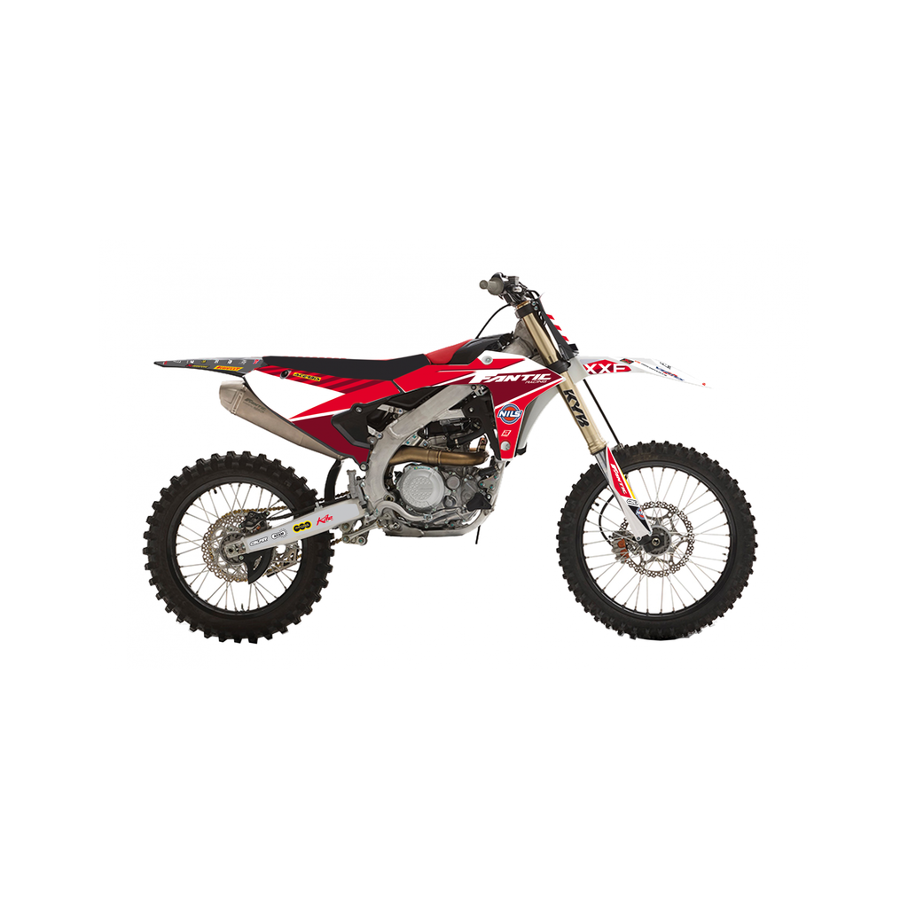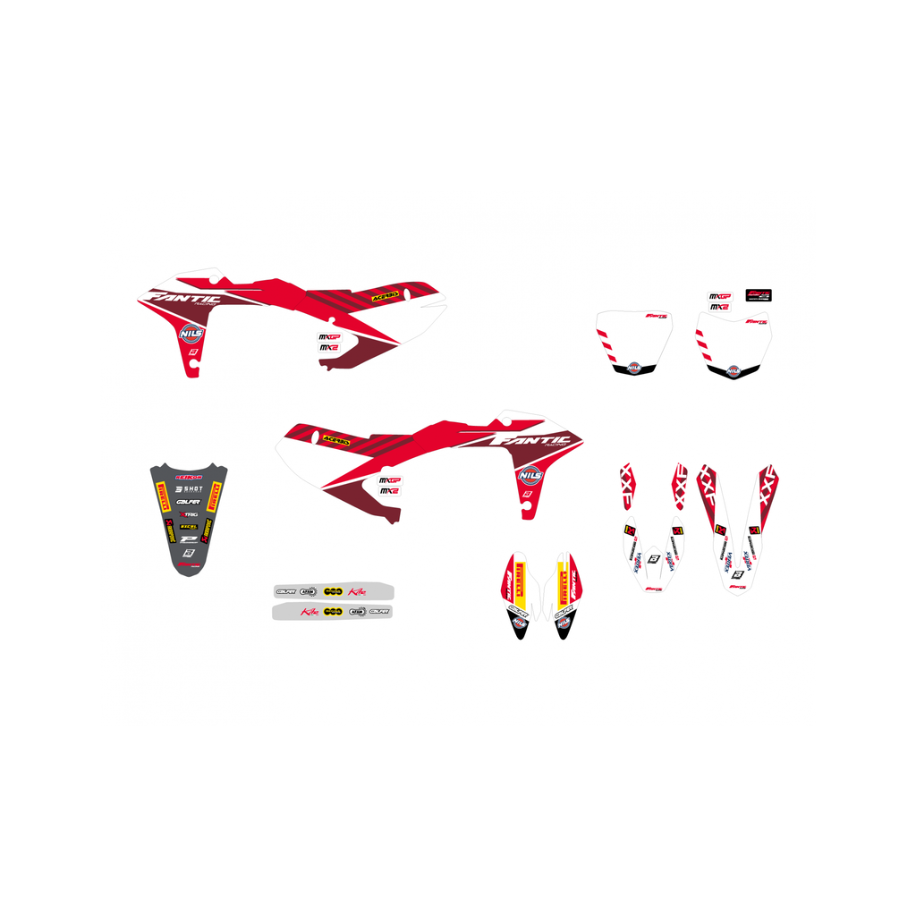 Kit déco complet : ouïes de radiateur, housse de selle, garde-boue avant/arrière, protections de fourche et stickers de bras oscillant