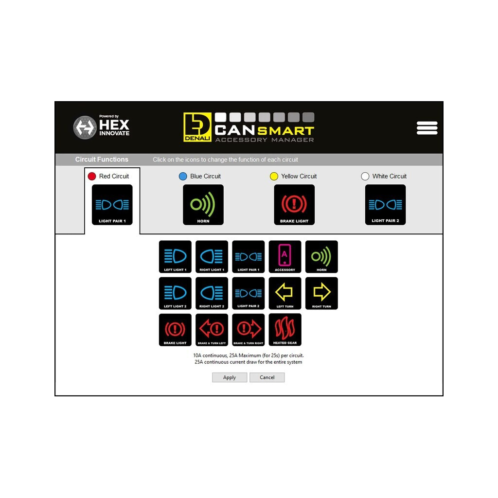 Gen II - Plus de fonctions, plus de puissance, plus de polyvalenceContrairement au CANsmart Gen I, les quatre circuits du Gen II peuvent fournir une puissance continue de 10 ampères et chaque circuit peut être configuré pour faire fonctionner n'importe quel type d'accessoire. La puissance maximale absorbée par l'ensemble de l'unité reste de 30 ampères continus. Le Gen II propose également deux nouveaux réglages pour la lumière auxiliaire. Vous pouvez désormais moduler vos feux auxiliaires pour une meilleure visibilité et régler vos feux latéraux gauche et droit pour qu'ils s'éteignent indépendamment lorsque vous activez le clignotant correspondant.Caractéristiques