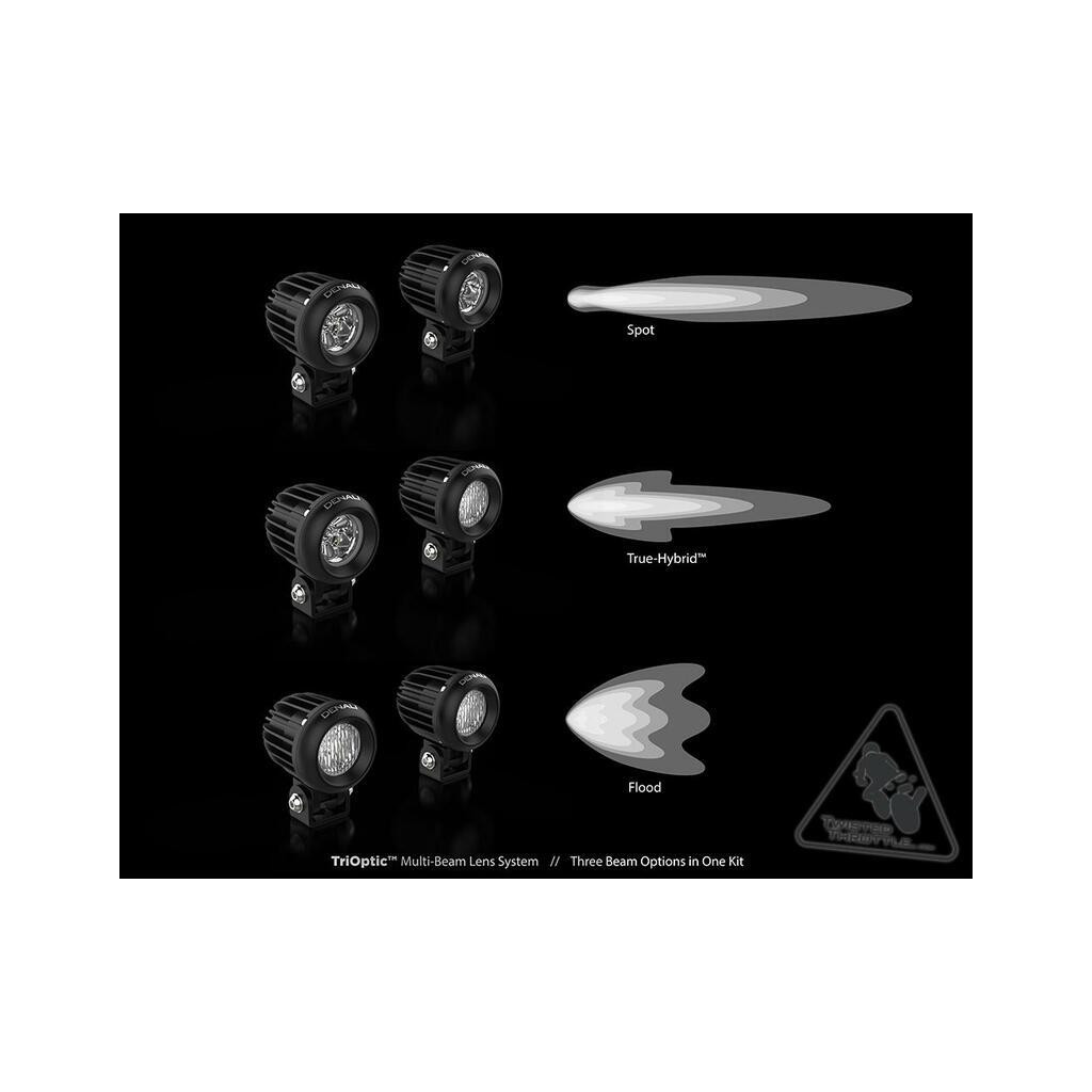 Le kit d'éclairage DENALI D2 2.0 LED TriOptic™ avec technologie DataDim produit une quantité remarquable de lumière dans un ensemble très compact qui est parfait pour tous les styles de conduite et les types de motos. Avec une puissante LED Cree de 10 watts, le DENALI D2 projette un faisceau puissant à 160 m sur la route.Logés dans des boîtiers compacts en aluminium, les DENALI D2 sont peut-être le modèle le plus polyvalent qui soit : suffisamment puissants pour être votre feu de route principal, mais suffisamment petits et légers pour être montés confortablement sur un garde-boue. Les DENALI D2 sont dotés d'une finition durable en poudre noire et d'ailettes de refroidissement spéciales pour s'assurer que la LED elle-même fonctionne de manière froide et lumineuse. La nouveauté de la série DENALI 2.0 est une lunette anti-corrosion Impact PC™ qui garantit que vos feux resteront beaux même après des impacts répétés de pierres et de débris.Autre nouveauté de la génération DENALI 2.0, le système de lentilles TriOptic™, à la pointe de l'industrie. Chaque lampe est livrée avec une lentille spot (installée) et une lentille flood (fournie), rien d'autre à acheter. La lentille spot produit la plus grande distance de faisceau, tandis que la lentille flood produit une diffusion plus large de la lumière plus près de la moto, remplissant le bord de la route et les accotements. Pour obtenir le meilleur des deux mondes, utilisez une lentille spot sur un feu et une lentille flood sur l'autre feu pour un éclairage à distance et une diffusion utile de la lumière à courte distance. Quelle que soit la lentille choisie, le kit D2 2.0 vous permet de voir la route (ou l'absence de route) et d'être vu par les autres véhicules qui vous entourent. C'est aussi simple que cela : Voir plus loin, être mieux vu, avec DENALI !