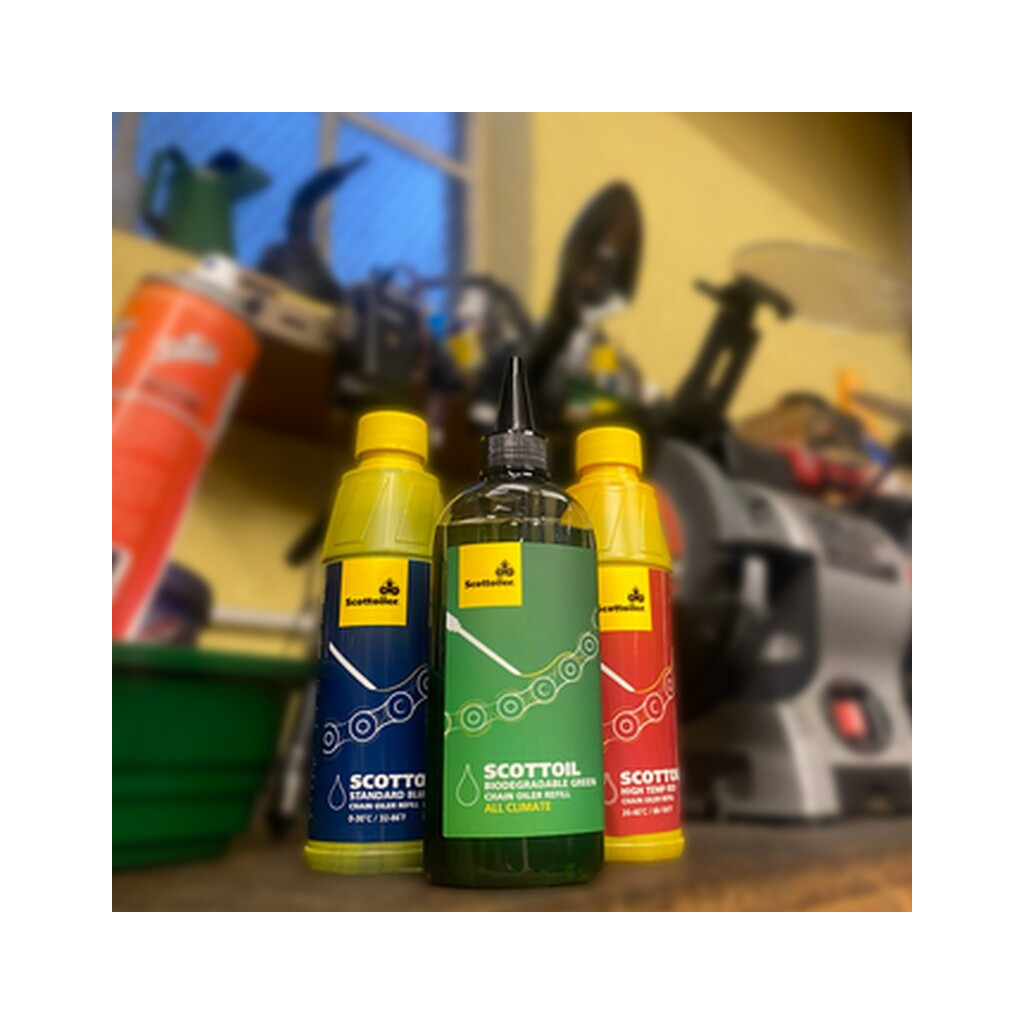 Les lubrifiants Scottoil vert biodégradable pour toutes les conditions climatiques sont les nouveaux lubrifiants pour chaînes compatibles avec tous les graisseurs de chaînes Scottoiler. Convenant à toutes les températures de conduite de 0 à 40°C, c'est la solution la plus simple pour rouler, sans avoir besoin de changer d'huile en fonction des changements de température de la route. Mélangée à une base d'huile végétale, la solution Scottoil est extrêmement respectueuse de l'environnement grâce à sa bouteille en plastique recyclable et à son bouchon à fermeture tournante.