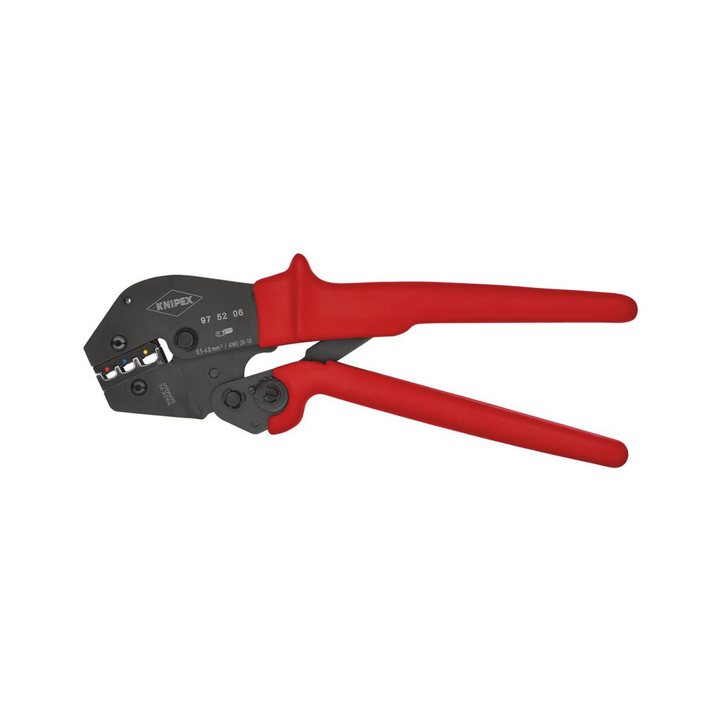Pince à sertir 97 52 06 SB Pour des connexions électriques sans soudure. L'ingénieux système de levier réduit la force manuelle jusqu'à 30 % par rapport à une pince à sertir classique. Qualité de sertissage élevée et constante grâce aux matrices de précision et au mécanisme à cliquet (déverrouillable). Outils réglés avec précision (calibrés) en usine. Sertissage aisé des conducteurs de gros diamètre grâce à une utilisation à deux mains. Manipulation aisée grâce à un centre de gravité bien équilibré, une tête coudée et des poignées ergonomiques. Matrice de sertissage non interchangeable. - Application : connecteurs isolés - Capacité en millimètres carrés : 0,5 à 6 mm² - Nombre de profils de sertissage : 3 - AWG : 20 à 10