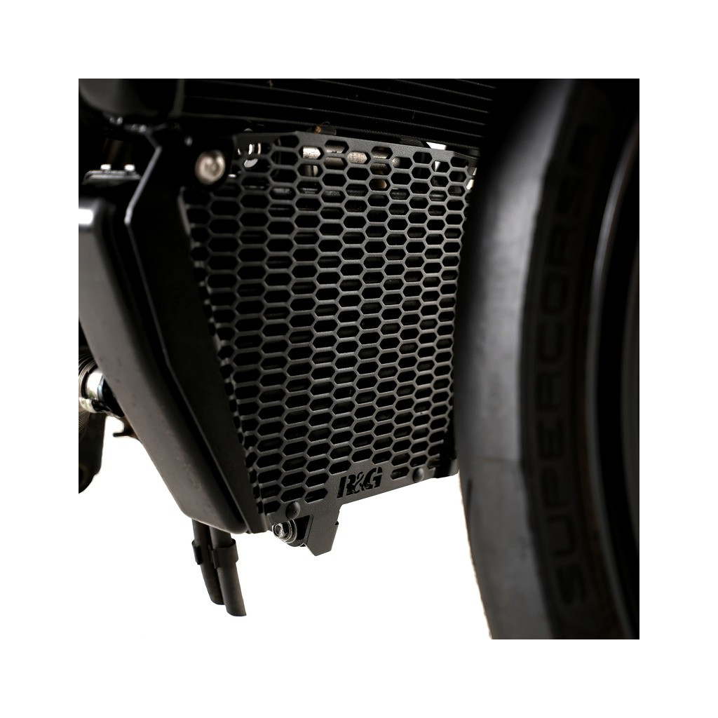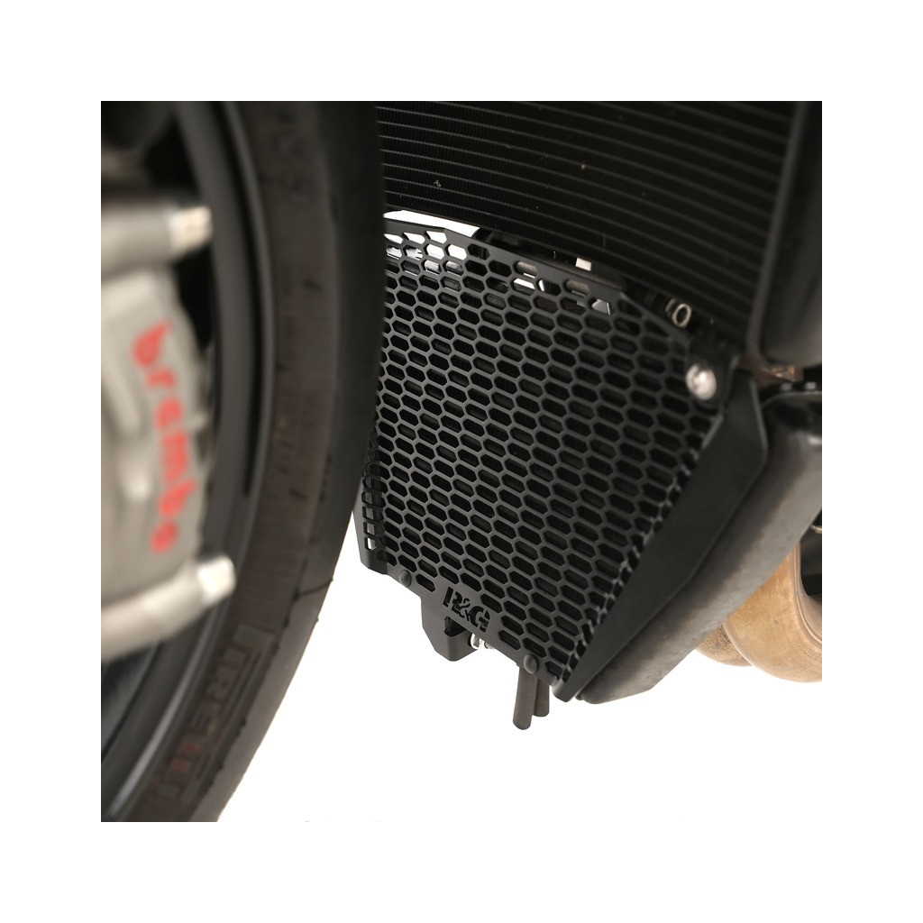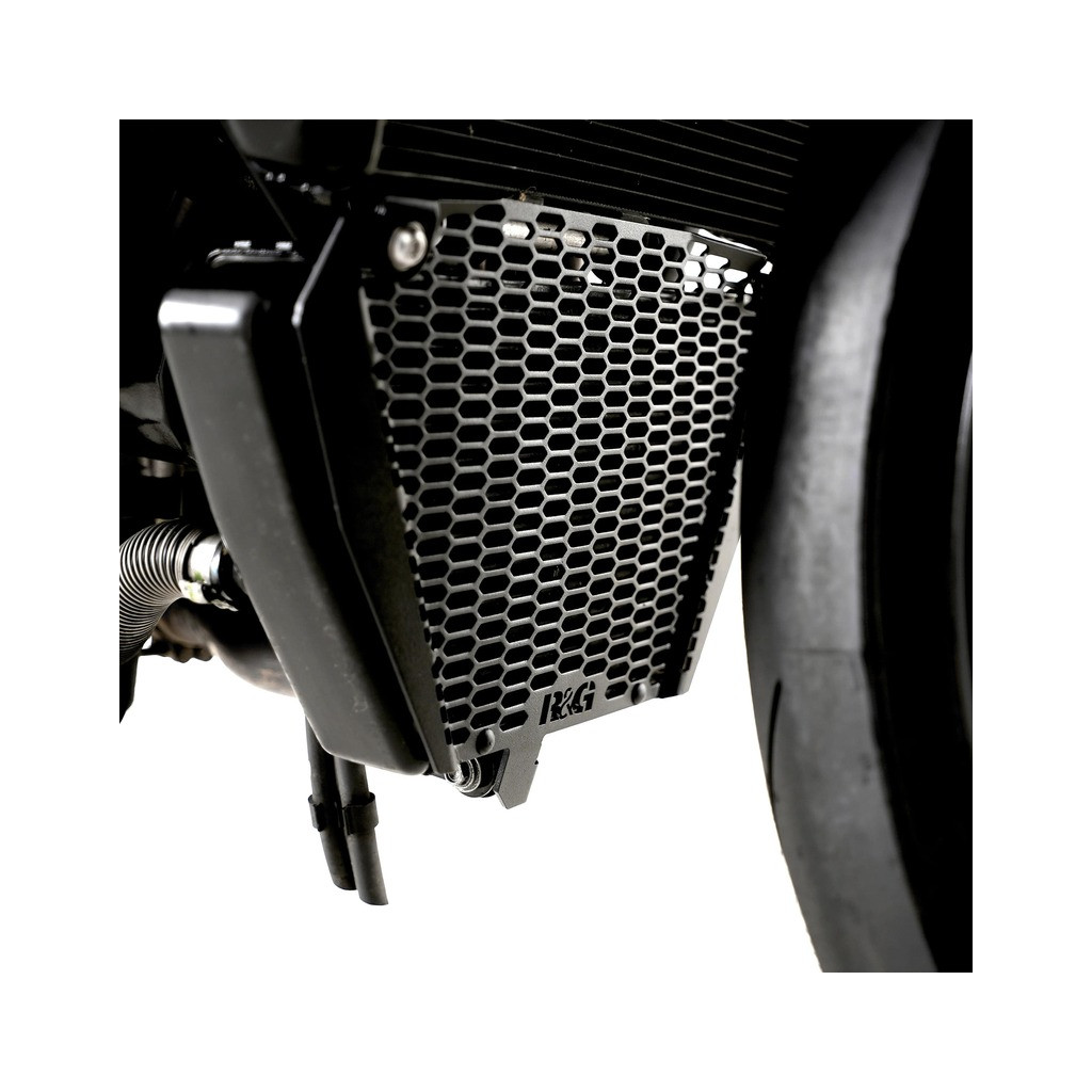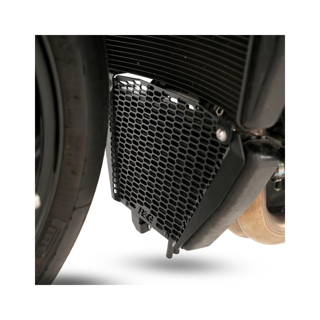 La protection de radiateur d'huile PRO présente un design géométrique "Hexa" optimisant la circulation d'air. Usinée dans une seule pièce d'aluminium léger de qualité, elle offre un excellent rapport résistance/poids.