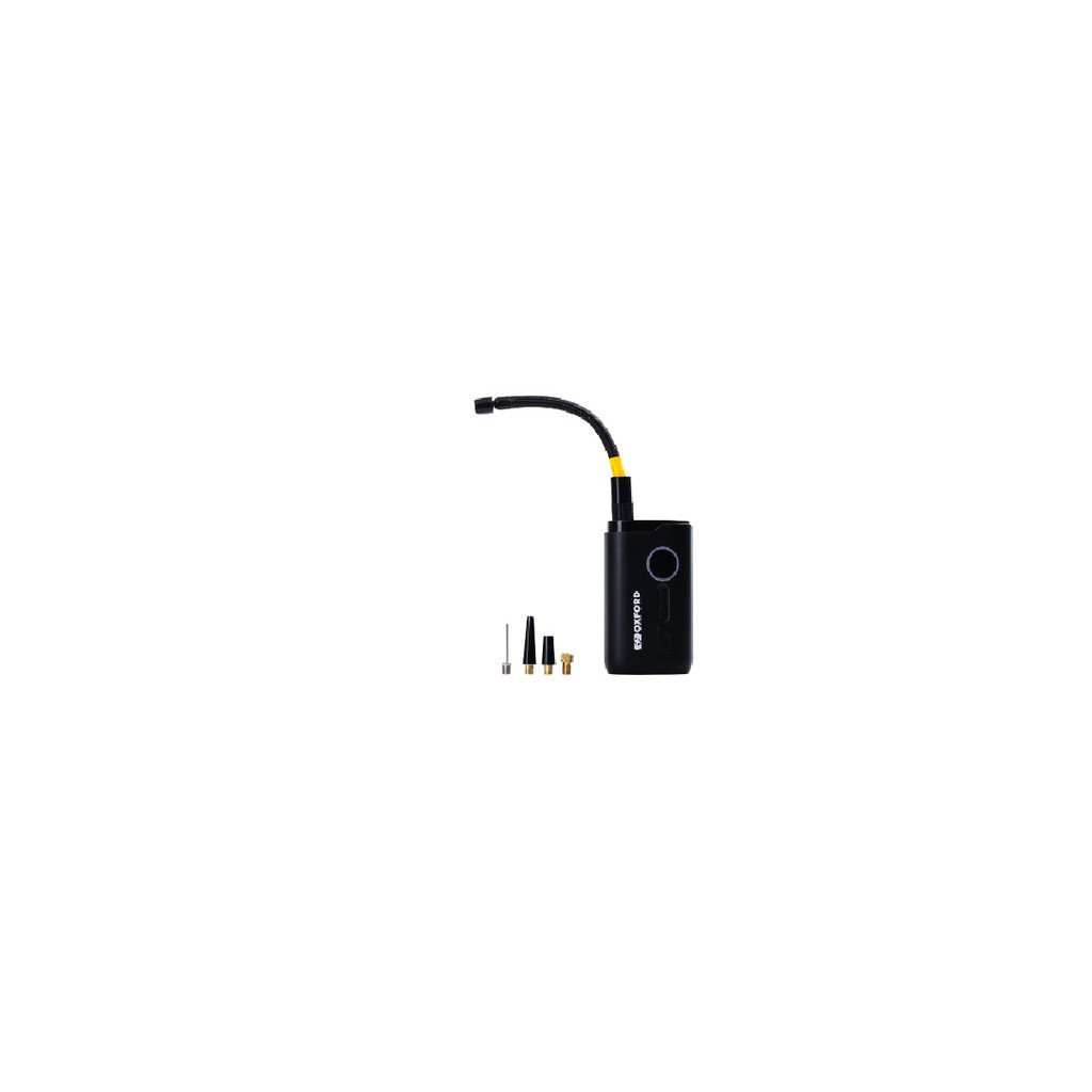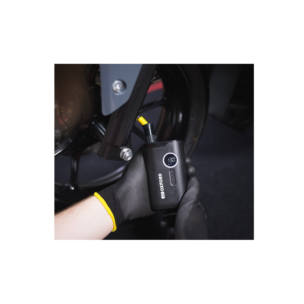 Pompe à pneu OXFORD Micro Jet. Compacte et portable. Pression maximale 7 bar (100 PSI). Idéale pour motos et scooters. Manomètre intégré. Connexion rapide valve Presta et Schrader.