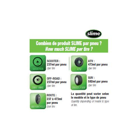 Cependant SLIME n’obture pas les perforations présentes sur les flancs des pneus et ne doit pas être utilisé avec des valves défectueuses ou dont les rebords sont endommagés. Ce produit est à utiliser à titre préventif pour des véhicules roulant à des vitesses inférieures à 100 km/h (l’enduit peut causer des vibrations au-delà de cette vitesse).