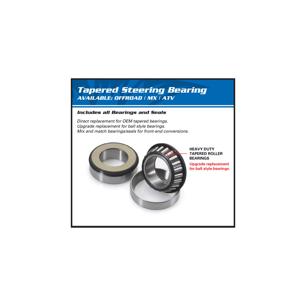 Les kits roulement ALL BALLS pour colonne de direction sont dotés de rouleaux coniques, ce qui permet à la pièce de supporter des charges plus élevées, tout en conservant une précision maximale de fonctionnement.