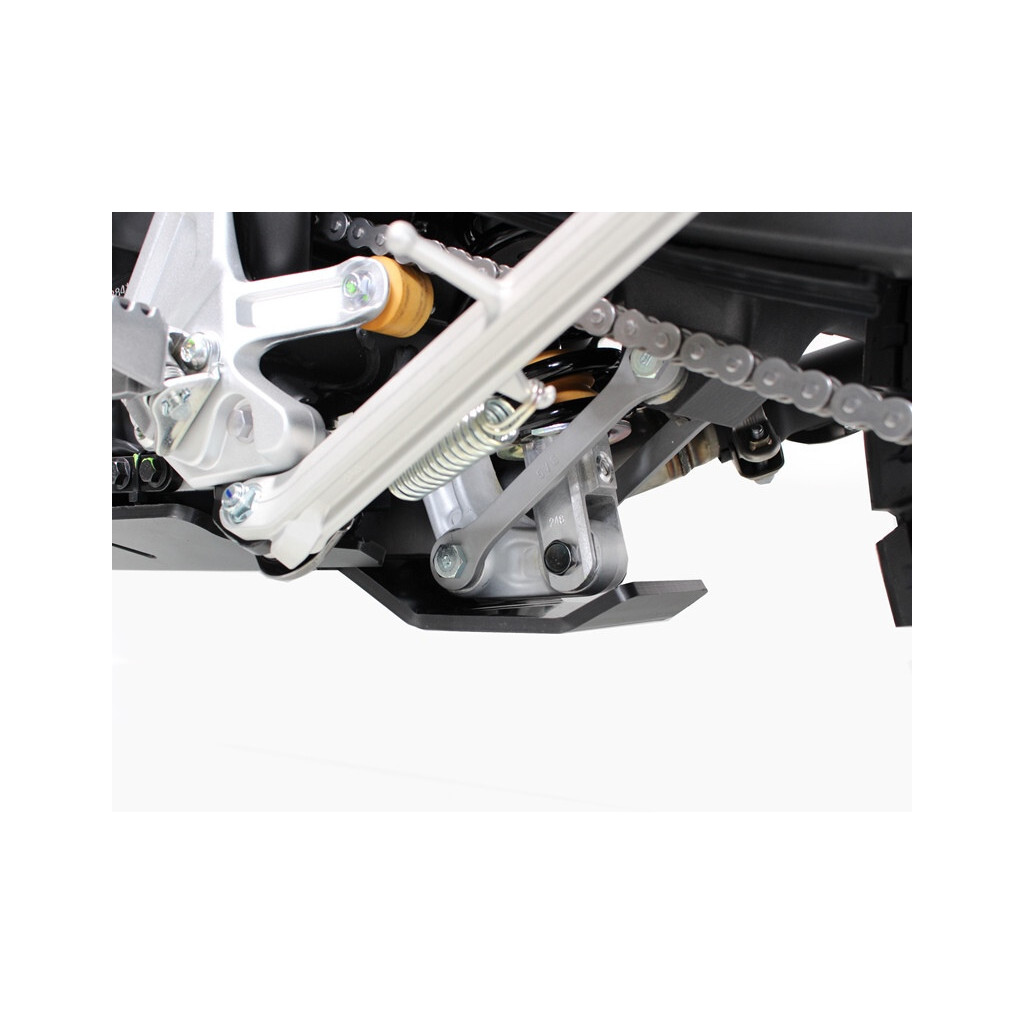 Protège le châssis, la biellette, le capteur de béquille latérale et les carters tout en suivant les lignes de la moto. Sa conception en plastique polyéthylène haute densité d’épaisseur 8mm procure une protection renforcée tout en étant de 30 à 40% plus léger que l’aluminium pour un produit similaire.