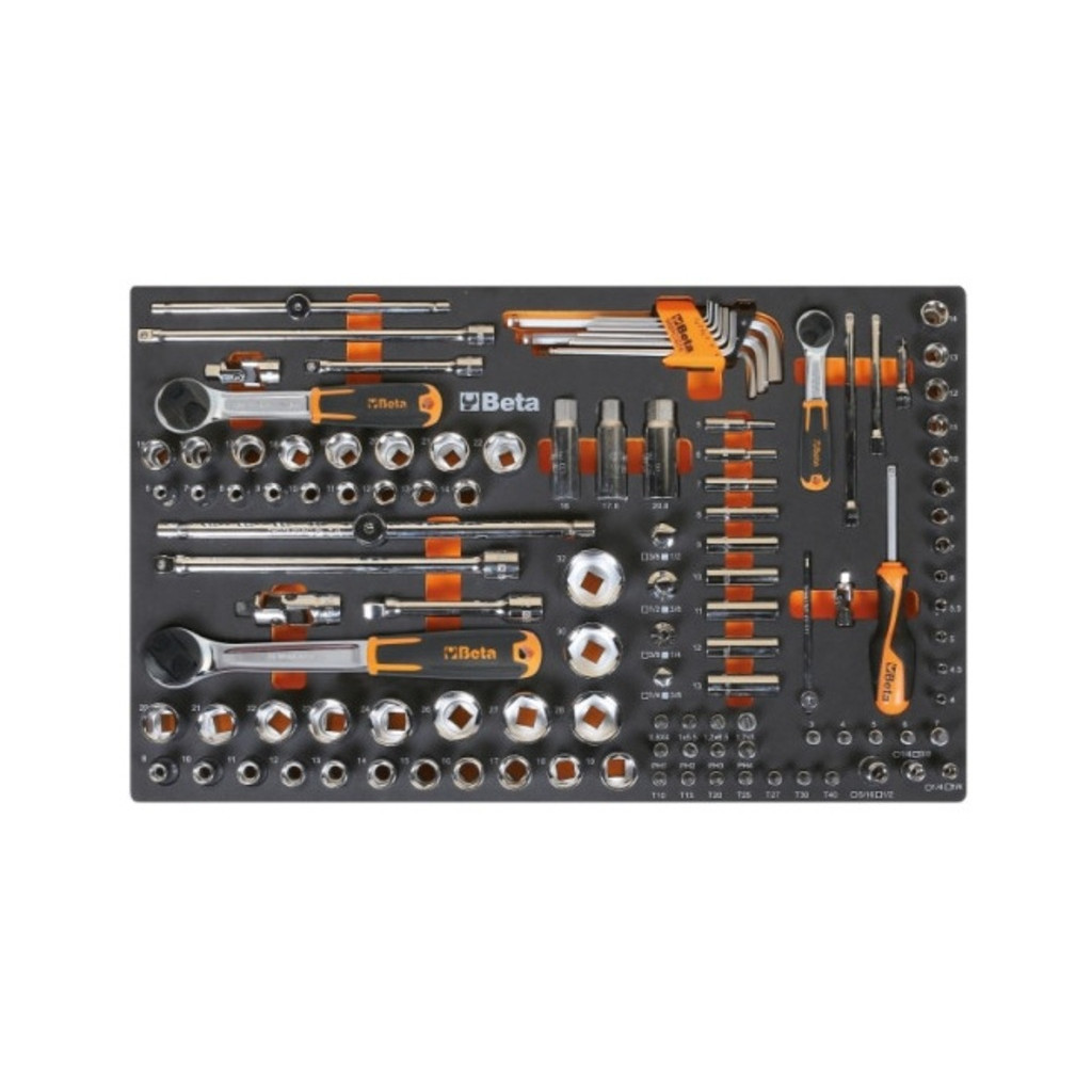 Plateau mousse BETA TOOLS avec composition de cliquets + douilles 1/4 et 1/2