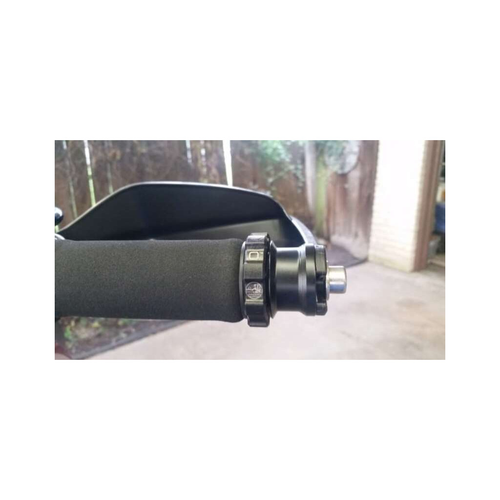 Le régulateur de vitesse et stabilisateur d'accélérateur KAOKO est un dispositif mécanique qui, une fois activé, applique une friction sur le tube d'accélérateur situé sous la poignée en caoutchouc. Cela permet de régler la position de l'accélérateur de manière dynamique.