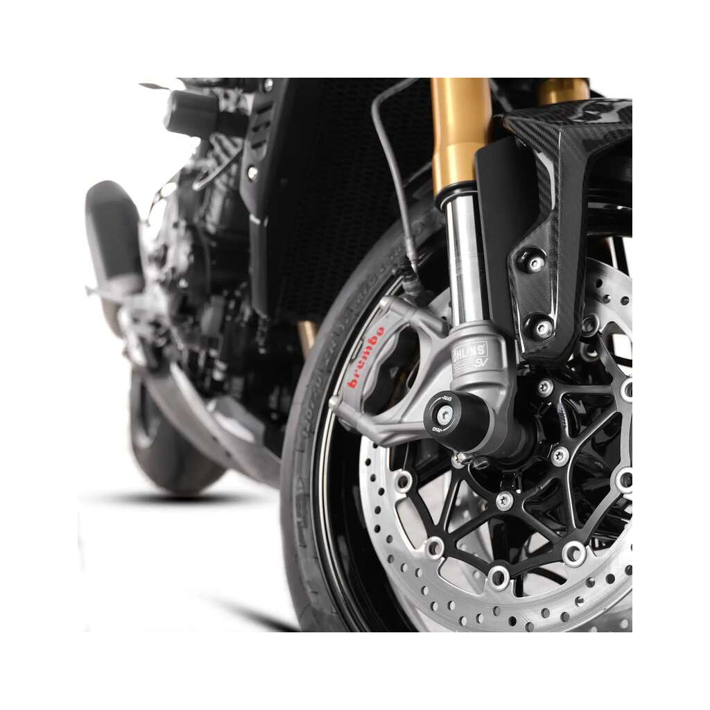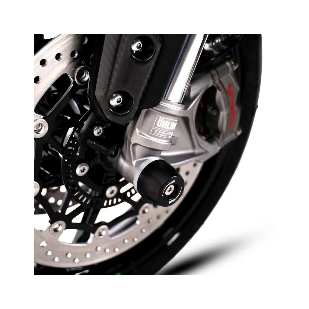 Protections de fourche R&G Racing. Protègent les fourreaux de fourche vulnérables en cas de chute ou de glissade. Construction en polyamide haute résistance avec embouts remplaçables. Installation simple sans modification permanente de la moto.
