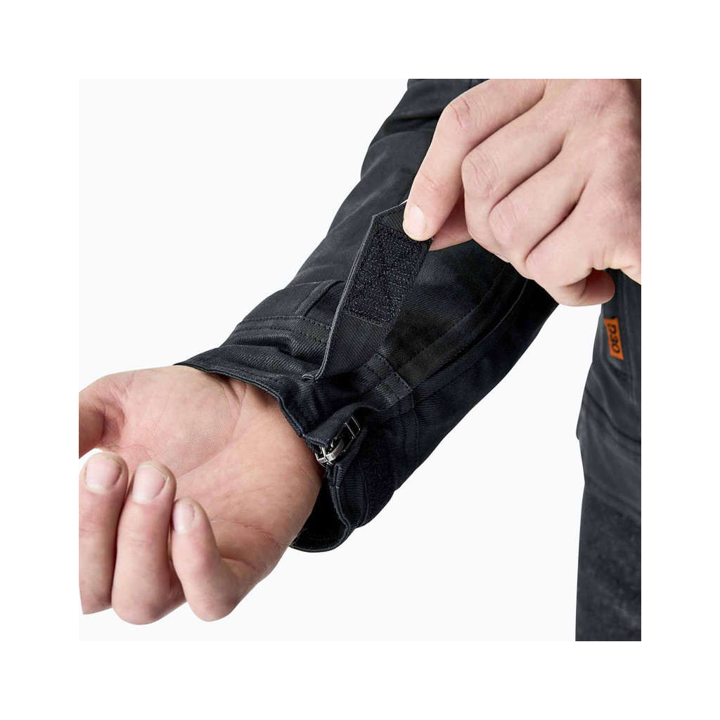 Fabriquée en coton ciré HD robuste et résistant, renforcé par des fibres d’Aramide. La veste est équipée de protections D30 Niveau 1 aux épaules et aux coudes, ainsi que d’une poche pour une dorsale. Elle dispose également d’une doublure thermique matelassée amovible et d’aérations placées à la poitrine et à l’arrière pour favoriser la circulation de l’air. Des réglages à la taille et aux poignets permettent un ajustement parfait. Ses zones extensibles autour des coudes offrent une grande liberté de mouvement et un confort optimal en conduite.