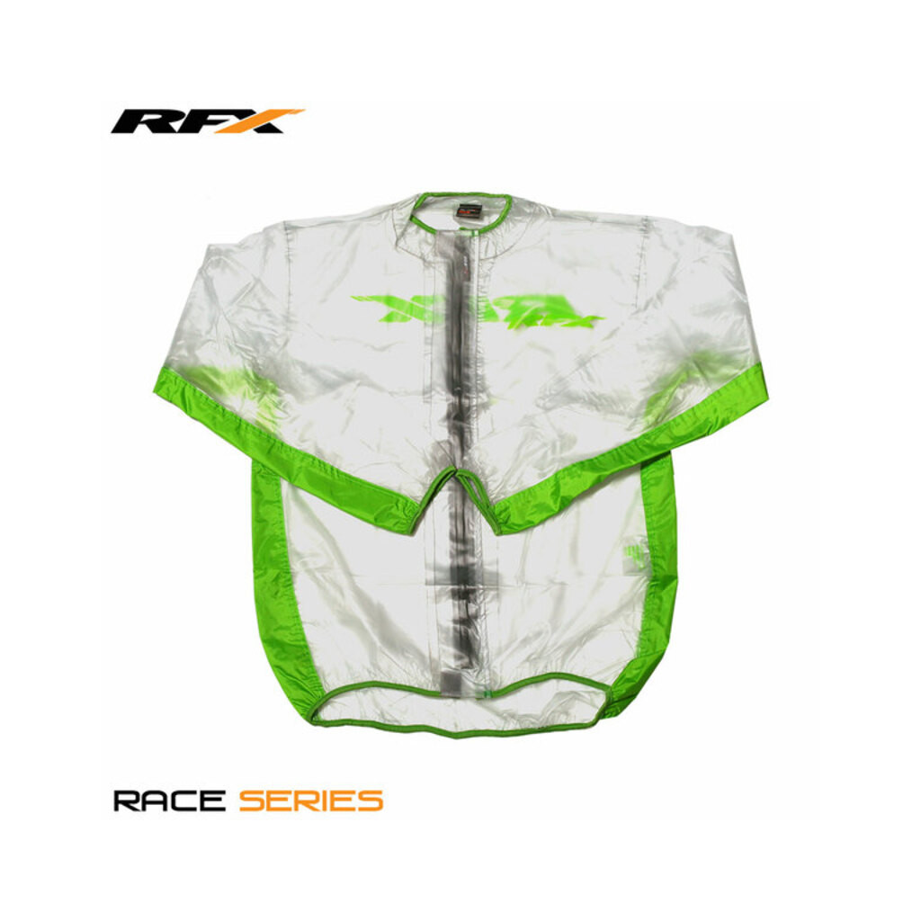 Veste de pluie RFX série course (Transparent/Vert) Taille adulte Les vestes de pluie RFX sont parfaites pour les compétitions boueuses. Avec des aérations aux aisselles et dans le dos, des coutures étanches, des bordures en lycra aux poignets et à la taille et des bandes réfléchissantes fabriquées en PVC transparent pour permettre de voir les équipements de course et les numéros des coureurs.
